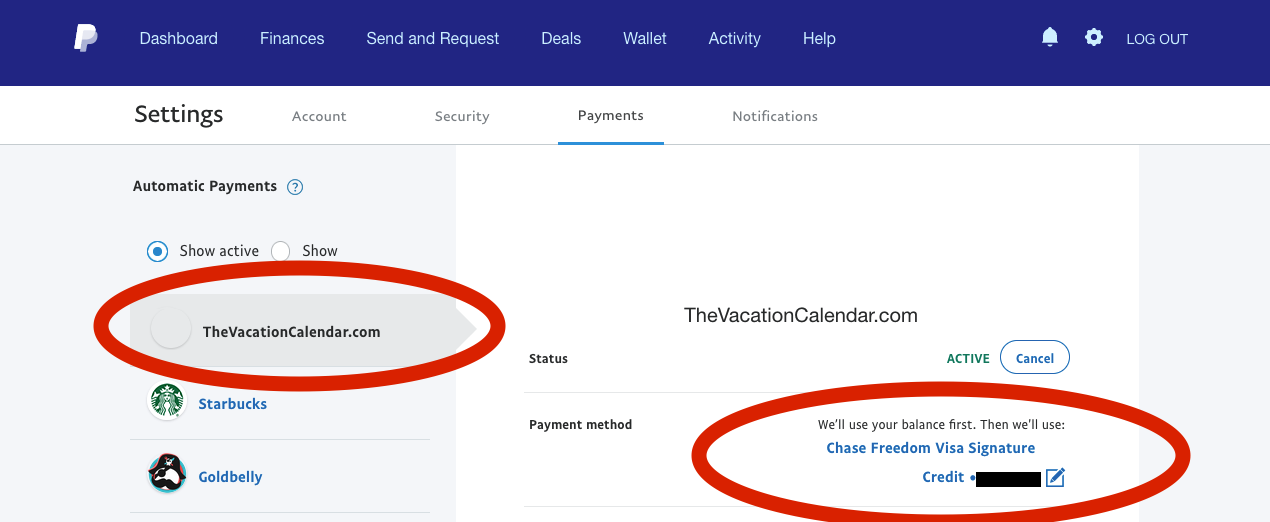 It is important to always have a valid payment method associated with the TheVacatioCalendar.com automatic payment. You can find this screen in PayPal by going to Settings —> Payments —> Automatic Payments .